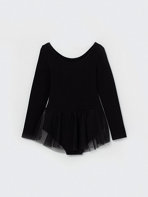 Купальник с длинным рукавом и с юбкой из сетки в цвет основного полотна. Вырез горловины и проймы ножек окантованы бейкой из основного полотна.