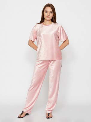 Блузка свободного силуэта с втачными рукавами. Спереди блестящая шелкография цветным глитером. Горловина обработана окантовкой из основного полотна. Рукава из основного полотна. Банты из гофрированная. Ширина волана 10 см.