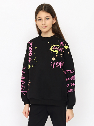 Джемпер с длинными рукавами, притачным поясом и манжетами. Манжеты и пояс выполнены из основного полотна. Горловина круглая с притачным воротником из полотна с добавлением лайкры. Перед и рукав декорированы принтом "Нарушай правила, будущее пренадлежит любознательным, юный и безбашенный, давай будем легендарными".