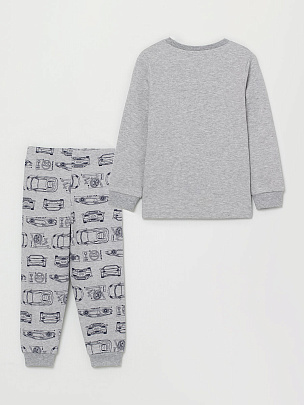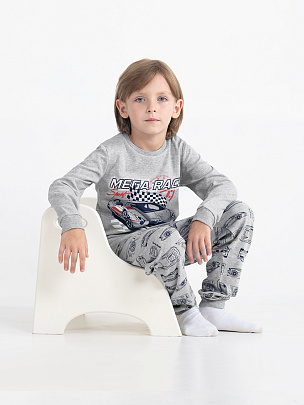 Джемпер для мальчика с длинными рукавами. Рукава втачные, с манжетами по низу. Горловина круглая, обработана воротником из полотна с эластаном. Брюки из набивного полотна с манжетами. По талии брюки собраны на резинку. Джемпер декорирован принтом.