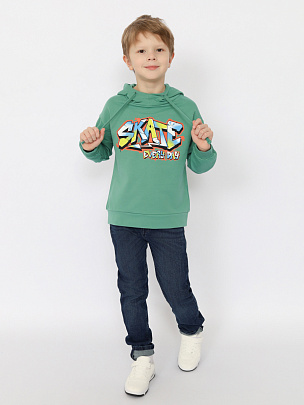Толстовка с длинными рукавами, притачным поясом и манжетами. Манжеты выполнены из полотна с добавлением лайкры, пояс выполнен из основного полотна. Капюшон со шнурком и подкладкой, верхняя часть декорирована вязаной нашивкой. Перед декорирован принтом "Катайся каждый день".