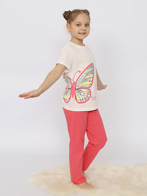 Пижама гладкокрашенная из футболки и брюк. Футболка свободного покроя с коротким рукавом. Горловина обработана притачной бейкой из рибаны с лайкрой. На правом боку принт в виде бабочки. Прямые брюки умеренного объёма выполнены из полотна дополнительного цвета. Цельнокроенный пояс обработан плоским швом вподгибку с одновременным прокладыванием резинки.