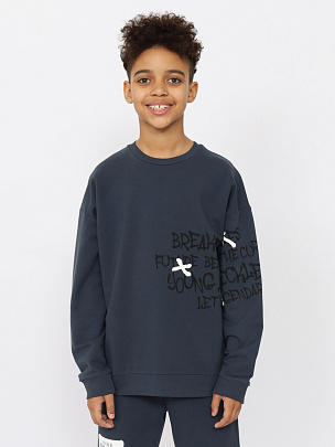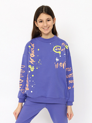 Джемпер для девочки с длинными рукавами. Горловина, рукава и низ изделия с эластичной резинкой. На полочке декоративный принт с блестящим эффектом и надписью - "Улыбнись". Брюки-джоггеры без карманов. Пояс притачной, со вставленной внутрь резинкой. В пояс вставлен шнур. Спереди деворативный принт с блестящим эффектом и надписью - "Привет". Внизу манжеты.