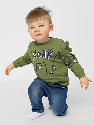 Свитшот с декоративной отделкой по рукаву.Воротник,манжет и пояс выполнены из материала с эластаном.Принт по переду.