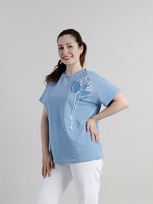 Футболка прямого силуэта длиной по линию бедер. Со спущенными плечами, короткий рукав. Круглая горловина обработана узкой притачной обтачкой из рибаны с эластаном. Полочка декорирована вышивкой шнуром.