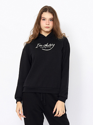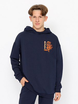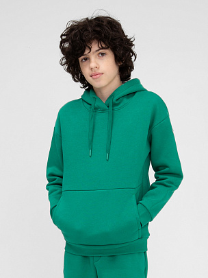 Толстовка для мальчика с капюшоном со шнурком, карман-кенгуру. Манжеты и пояс из эластичной рибаны. На рукаве декоративная силиконовая нашивка.