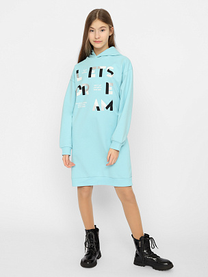 Платье для девочки с отрезной юбкой и кулиской со шнуром по шву притачивания юбки. Рукава короткие, со сборкой по окату. Горловина круглая, окантована бейкой из основного полотна. Перед платья декорирован принтом с вышивкой пайетками.